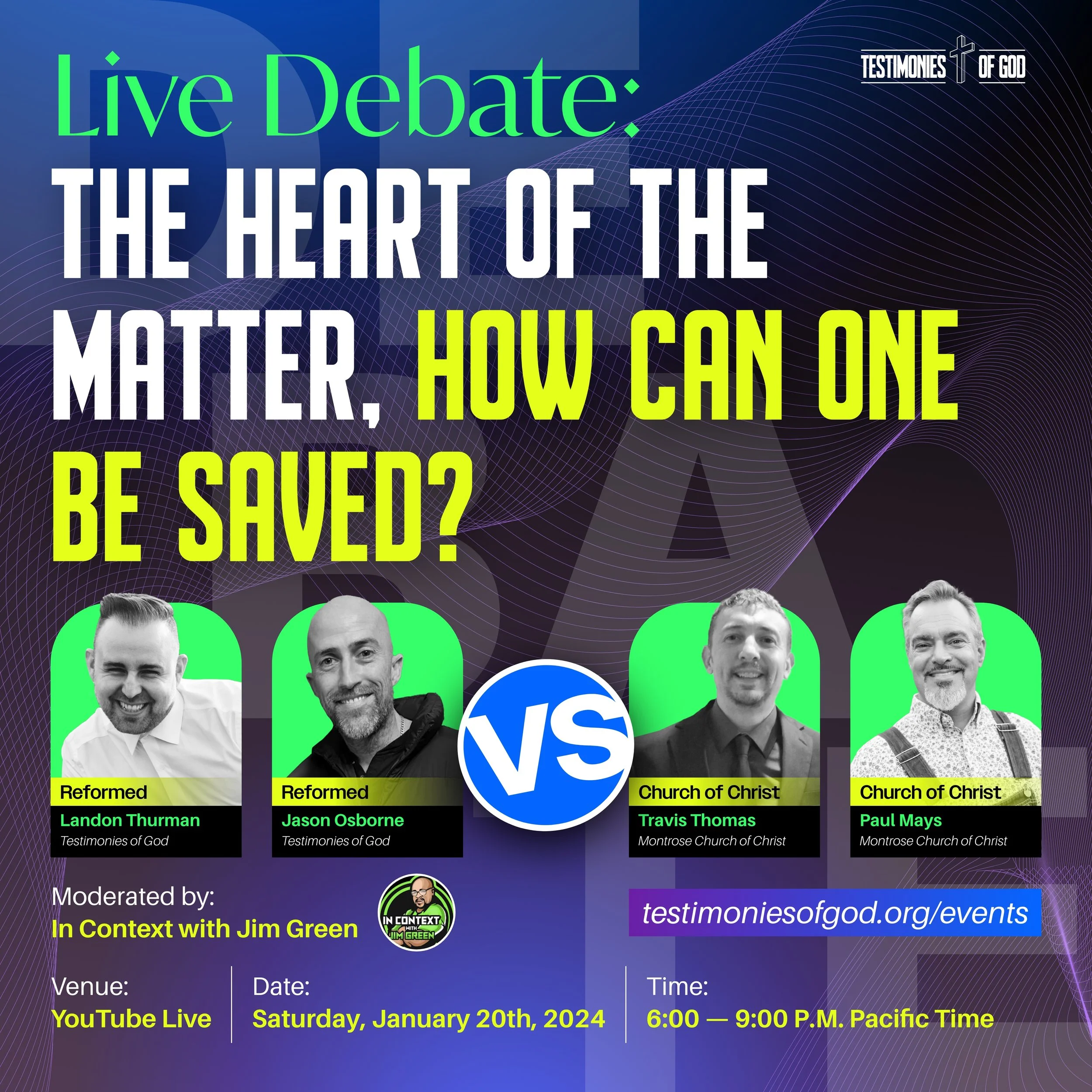 Join us for a YouTube Live debate on January 20th, 2024, from 6:00 PM to 9:00 PM PST. We will discuss the essential truth of how one is saved according to Scripture and expose the errors of the ICC & ICOC cult and their doctrinal beliefs. Our moderator, Brother Jim Green from In Context with Jim Green, will lead the conversation. The debaters, Travis Thomas and Paul Mays (Church of Christ), will face off against Landon Thurman and Jason Osborne (Reformed Baptists). The structured format includes Opening Statements, Rebuttals, Cross-Examination, Audience Q&A, and Closing Arguments, ensuring a thorough exploration of how one is saved. You can join the live debate in the comment section and reserve your questions for the designated Q&A session. We hope to come together in love and respect to point out the error of man's belief and the truth of the Word of God on this critical topic. Romans 3:4 says, "Rather, let God be found true, though every man be found a liar, as it is written, 'THAT YOU MAY BE JUSTIFIED IN YOUR WORDS, AND PREVAIL WHEN YOU ARE JUDGED.'" For more details, please visit the event website link. We want to hear your thoughts and engagement on this matter and look forward to your presence at this debate.